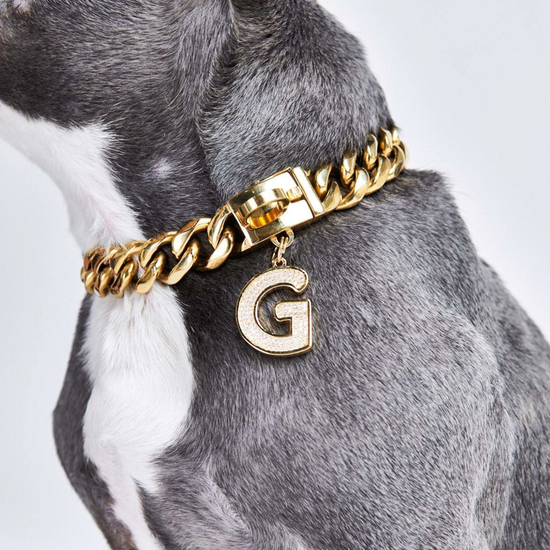 Pas de halsband van je hond aan met dit luxueuze sieradenstuk. De letterhanger is ontworpen met comfort en veiligheid in gedachten, perfect voor dagelijks gebruik. De 18k goudplating en CZ-diamanten zullen licht vangen vanuit alle hoeken, waardoor de nek van je hond de hele dag en nacht straalt.